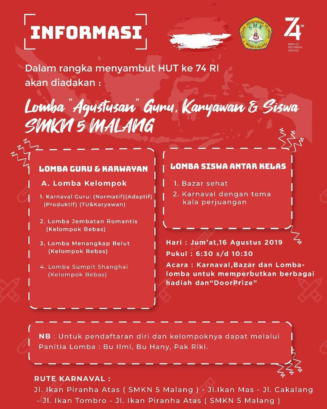 Dalam rangka menyambut HUT ke 74 RI SMKN 5 Malang mengadakan Lomba "Agustusan" Guru, Karyawan & Siswa