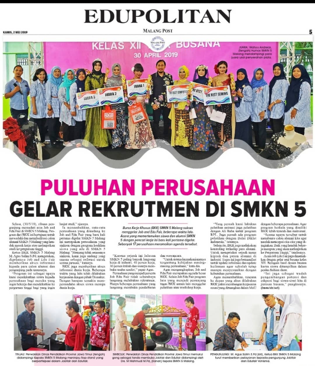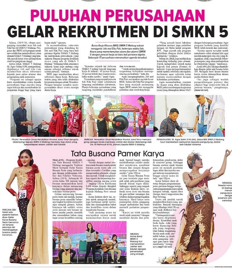 job & edu Fair Vohisma 2019 serta Pagelaran Busana Pesta Karya siswa kelas XII TB tampil di halaman Edupolitan Malang Pos.