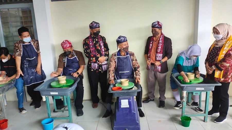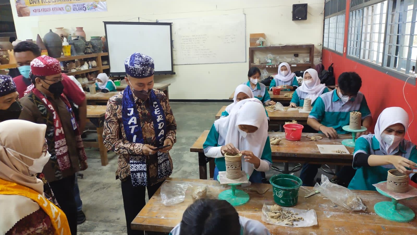 KERAMIK: Pj Sekda Prov Jatim sekaligus Kepala Dinas Pendidikan Provinsi Jawa Timur Dr. Ir. Wahid Wahyudi M.T menjajal proses pembuatan keramik di Bengkel Kriya Keramik SMKN 5 Malang